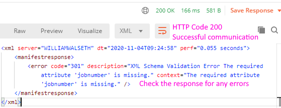 As an example, here's a simple error showing a missing job number on the manifest service.